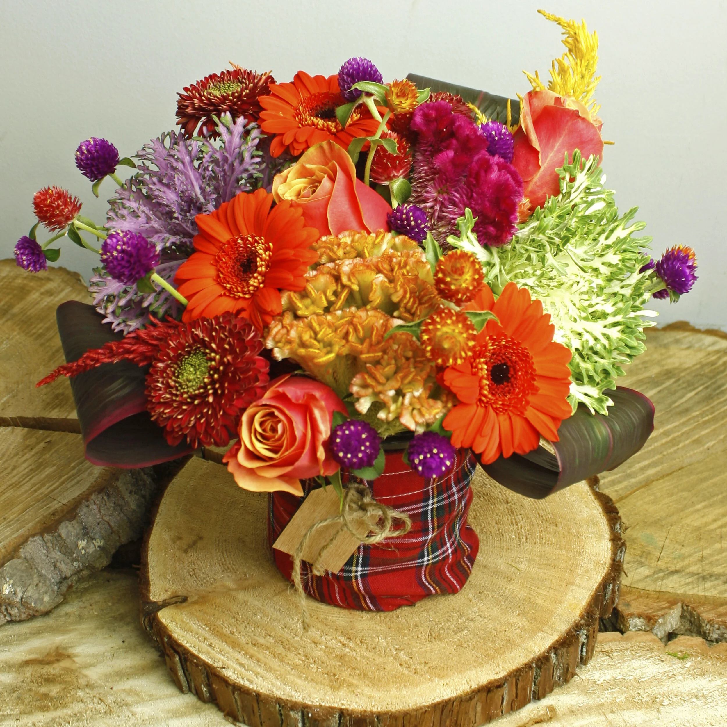 Stunning fall flowers in a cute plaid container, perfect for any fall gift! This stunning and vibrant blooms are great for any occasion. Long Stems has been providing the Greater Philadelphia Area with the largest selection of fresh cut flowers for over 40 years. Click or Call 610-664-7352 to order a cute fall arrangement today! We deliver daily to Drexel Hill, Ardmore, Merion Station, New Hope, Valley Forge and so many more!
